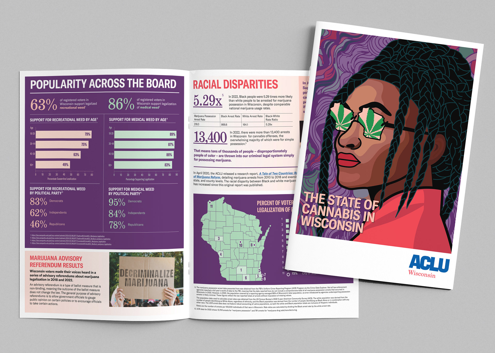 ACLU of Wisconsin protects the civil liberties of all people, regardless of their race, gender, political or religious views. They also work on campaigns to reform the criminal justice system, stand up for LGBTQ+ rights, and much more. I've created graphics and designed reports to help assist in their fight for justice and equality.