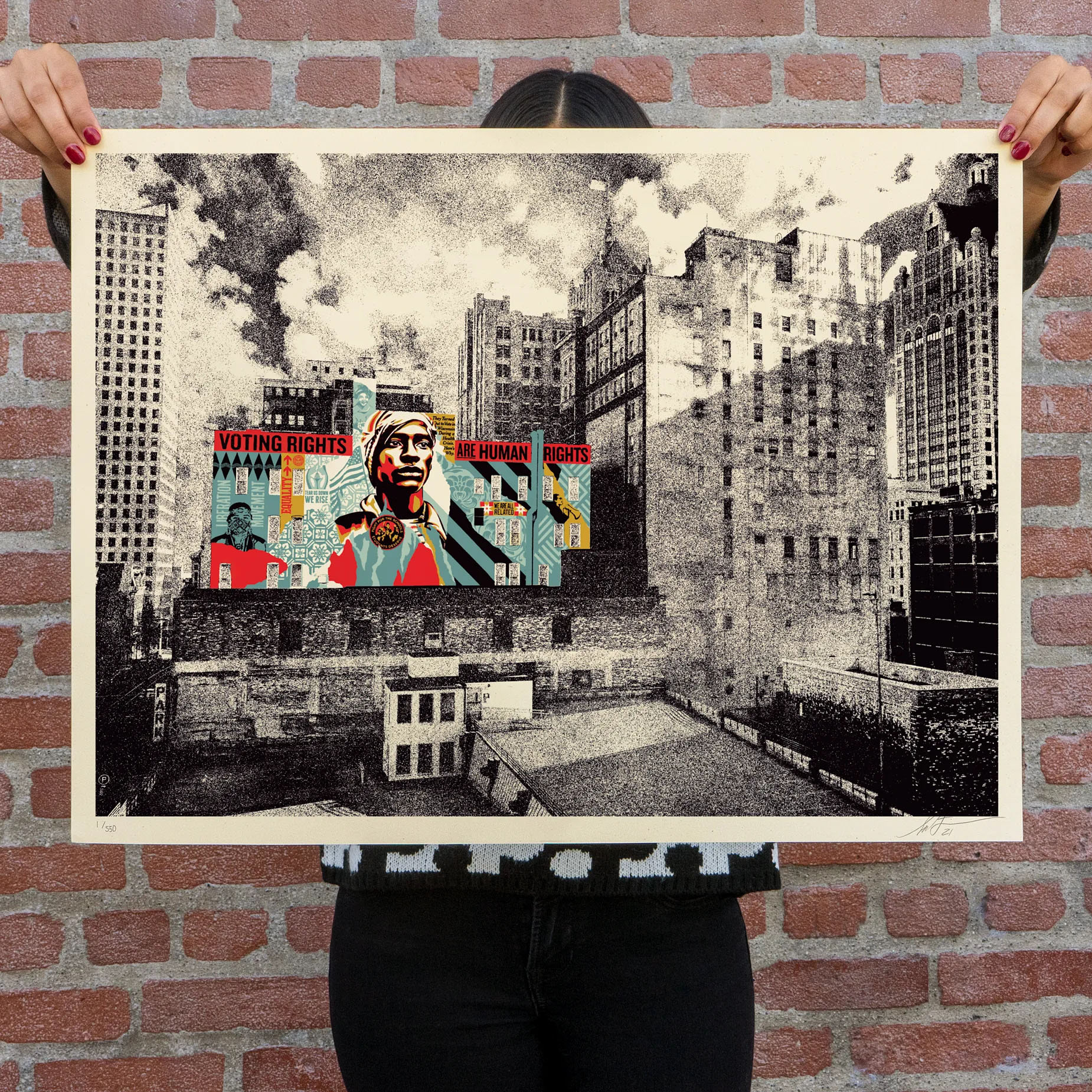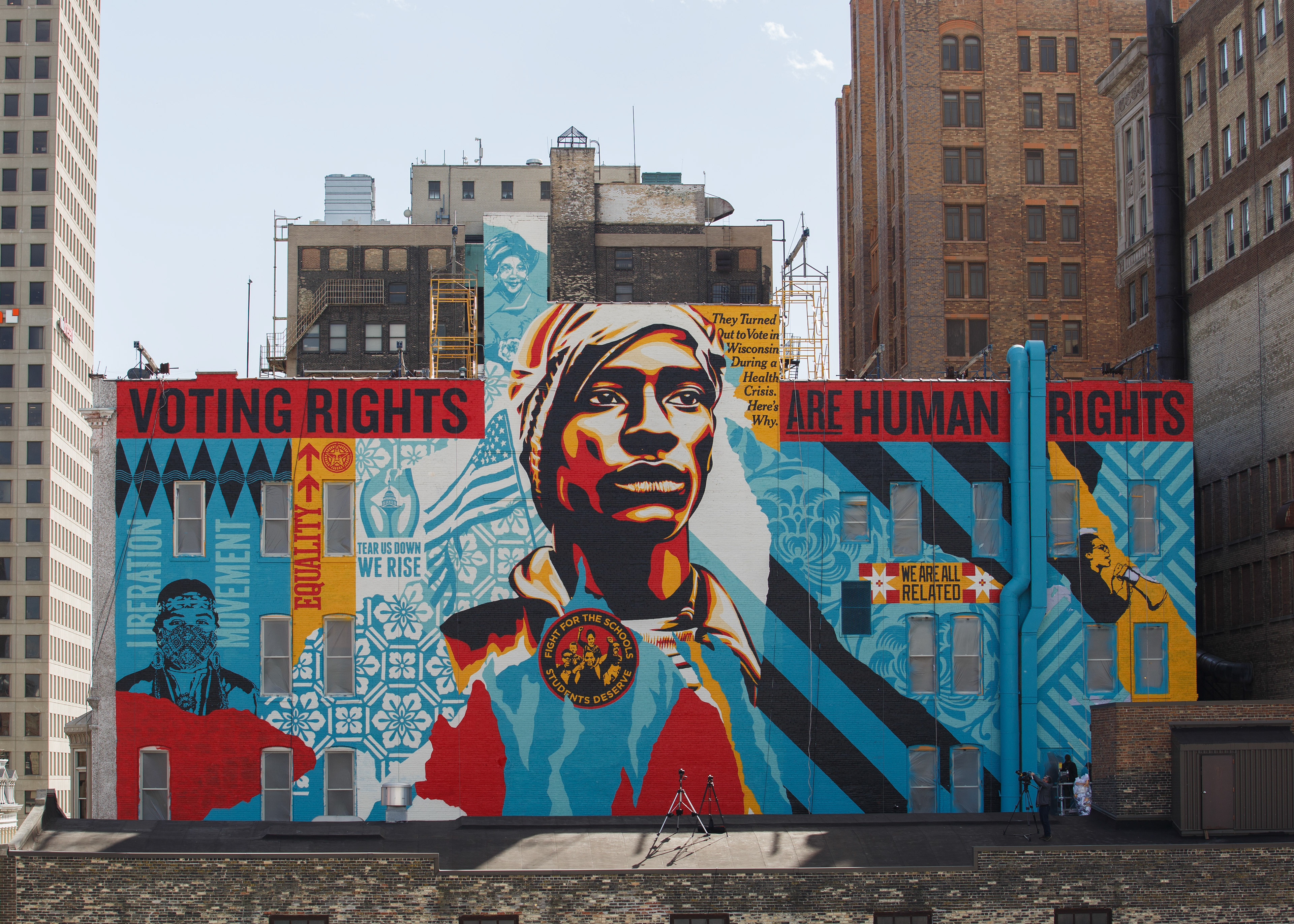 Prior to the 2020 presidential election, Shepherd Fairy (obeygiant.com) painted a large mural in downtown Milwaukee titled "Voting Rights are Human Rights," which celebrated the victory for voting rights but also serve as a reminder to no take that right for granted. I was fortunate to be to be part of the collaborative of artists whose work is included in the mural.